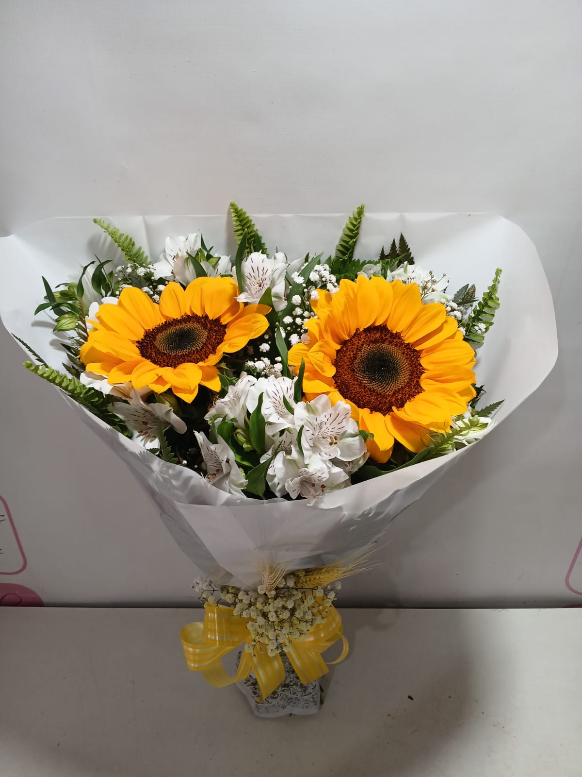 BUQUÊ COM 2 GIRASSÓIS MONTADO COM FOLHAGENS E COMPLEMENTOS, EMBALADO PARA PRESENTE COM LAÇO